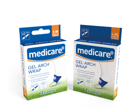 The Medicare® Gel Arch Wrap is designed to provide targeted relief for those suffering from foot discomfort, including plantar fasciitis, flat arches, and cavus foot. The shock-absorbing Biogel® reduces pressure and alleviates pain by supporting the arch. The wrap is made with soft, breathable fabric for comfort and includes mineral oils and skin-care ingredients to moisturise the skin.