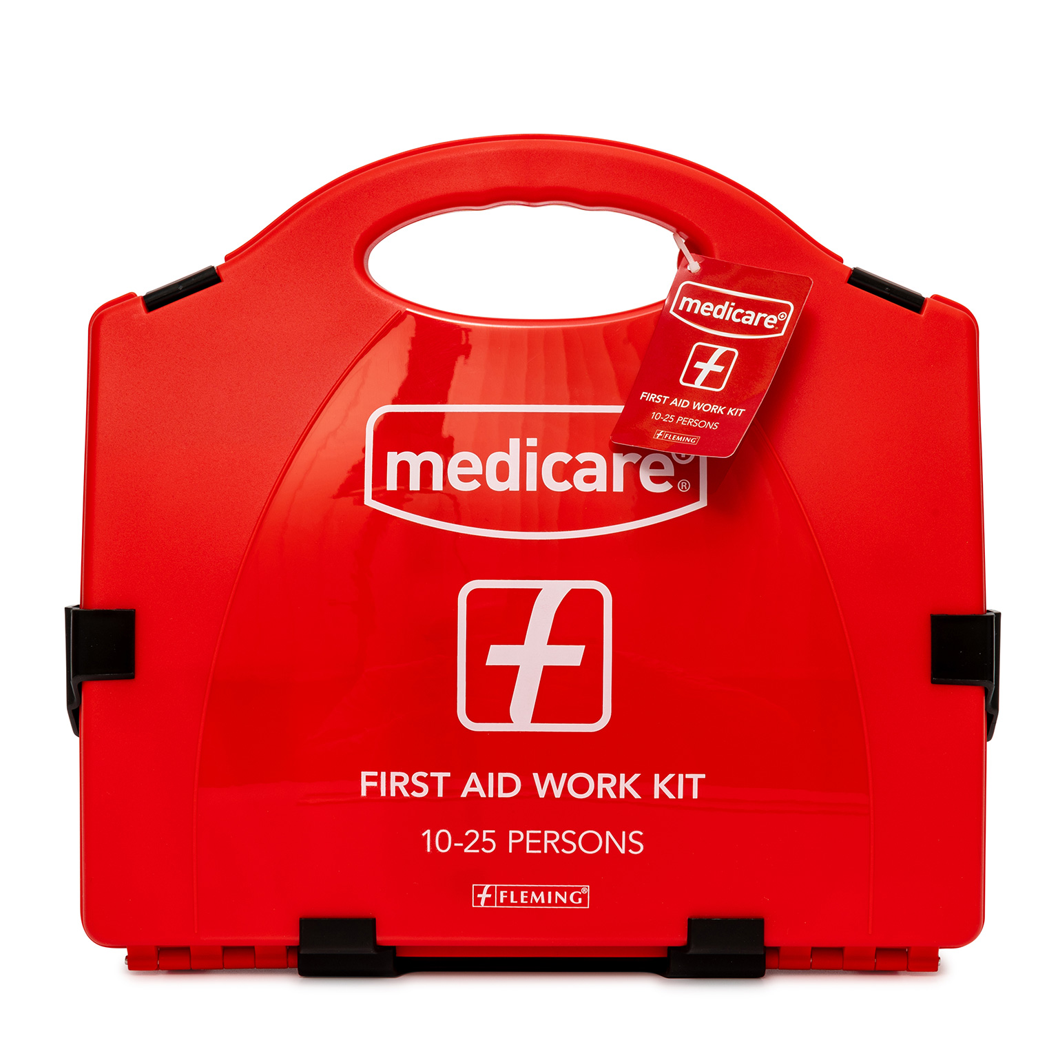 Medicare First Aid Work Kit 10-25 Persons is packed with all the essentials needed for any kind of emergency in the workplace. Features: – Multi-compartment, durable hard case with ergonomic handle – Easy click on/off wall mounting bracket included, just grab and go – Includes essentials needed for everyday cuts and scrapes as well as emergency situations – Suitable for 10-25 people – Meets HSA Content Guidelines Contents: – 20 x Adhesive Plaster (25mm x 72mm) – 20 x Adhesive Plaster (19mm x 72mm) – 2 x No. 16 Sterile Eye Pad Dressing – 2 x Crepe Bandage (7.5cm x 4.5m) – 10 x Sterile Eye Wash Solutions (20ml) – 10 x Disposable Gloves (Pairs) – 20 x Alcohol Cleansing Pads – 6 x Packs of Safety Pins – 6 x Triangular Bandage – 3 x No. 3 Ambulance Dressing (28cm x 20cm) – 2 x Medium Wound Dressing (12cm x 12cm) – 6 x Large Wound Dressing (18cm x 18cm) – 1 x Medium Burn Dressing (10cm x 10cm) – 1 x Large Burn Dressing (20cm x 20cm) – 1 x Paramedic Shears – 1 x CPR Face Shield – First Aid Guide – 1 x Carry Case Dimensions: 350mm (w) x 335mm (h) x 100mm (d)