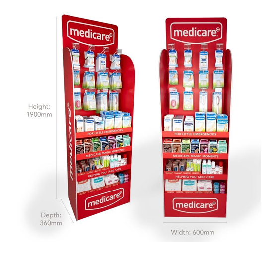 Medicare branded FSDU with 12 hooks and 4 shelves. Suitable to display free-standing and hanging products from our full Medicare range.